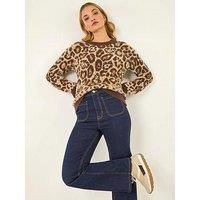 Dusk Embellished Animal Print Knit Jumper from Roman. Casual meets glamorous with this pearly detail knit jumper. Created with a crew neck and long sleeves, this beautiful knit also features a multi-gem hotfix embellishment, adding a touch of sophistication to this cosy piece. The soft hand touch and animal print design make it a must-have for the Autumn/Winter season. Pair with jeans and heeled boots for a stylish ensemble that transitions effortlessly from day to night! | Dusk Women's Embellished Animal Print Knit Jumper in Chocolate | Size: 16 - Manufacturers part number: Dusk_5063566433434