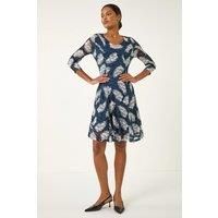 Leaf Print Lace Stretch Dress from Roman. Get ready to make a statement in this elegant lace dress adorned with a beautiful leaf print. Cut from a stretch lace fabric, this knee-length dress features a classic round neckline and 3/4 sleeves for a timeless look. The flattering fit ensures you look fabulous for any occasion. Pair with a denim jacket and ankle boots for a stunning autumnal ensemble! | Roman Women's Leaf Print Lace Stretch Dress in Teal | Size: 16 - Manufacturers part number: Roman_5063566437876