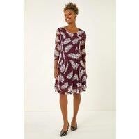 Leaf Print Lace Stretch Dress from Roman. Get ready to make a statement in this elegant lace dress adorned with a beautiful leaf print. Cut from a stretch lace fabric, this knee-length dress features a classic round neckline and 3/4 sleeves for a timeless look. The flattering fit ensures you look fabulous for any occasion. Pair with a denim jacket and ankle boots for a stunning autumnal ensemble! | Roman Women's Leaf Print Lace Stretch Dress in Wine | Size: 18