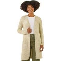 Metallic Longline Knit Cardigan from Roman. Shimmer and shine in style with this metallic longline cardigan. Perfect for the Autumn/Winter season, this stunning piece features long sleeves and an edge-to-edge front for easy layering. The metallic finish adds a touch of glamour to any outfit, making it a versatile and eye-catching addition to your wardrobe. Pair it with a simple t-shirt and jeans for a chic and cosy look that's perfect for everyday wear! | Roman Women's Metallic Longline Knit Cardigan Sweater in Gold | Size: 18 - Manufacturers part number: Roman_5063566447240