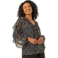 Petite Spot Print Frill Top from Roman. Set the trend this Autumn/Winter with the spot frill top. This versatile woven top features a stylish V-neck with delicate frill detailing, perfect for adding a touch of elegance to your look. The comfortable pull-on style makes it easy to wear, while the long set-in sleeves with frill accents add a chic finishing touch. Pair with jeggings and ankle boots for an effortlessly stylish ensemble that can take you from day to night with ease! | Roman Women's Petite Spot Print Frill Top in Black | Size: 12 - Manufacturers part number: Roman_5063566451254