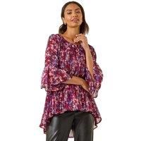 Metallic Abstract Pleated Top from Roman. Add a touch of intrigue to your wardrobe with this abstract printed top. Featuring a round neck and stylish 3/4 flared sleeves, this top is perfect for the Autumn/Winter season. The dropped back hem adds a modern twist, while metallic threads woven throughout the fabric give it a subtle shimmer. Pair with jeans and ankle boots for a chic and trendy look that transitions easily from day to night! | Roman Women's Metallic Abstract Pleated Top in Wine | Size: 10 - Manufacturers part number: Roman_5063566452442