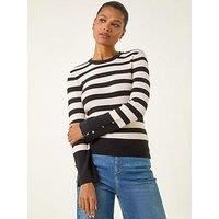 Stripe Button Detail Knit Jumper from Roman. Add a touch of timeless elegance to your Autumn Winter wardrobe with this stylish stripe button detail knit. Featuring a classic stripe pattern and finished with a smart round neckline, this knit is perfect for any occasion. The long sleeves with ribbed cuffs add a cosy touch with button details. Pair with wide-leg jeans and ankle boots for a complete look! | Roman Women's Stripe Button Detail Knit Jumper in Ivory | Size: 18 - Manufacturers part number: Roman_5063566454569
