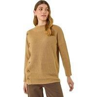 Side Buttoned Knit Jumper from Roman. Stay cosy and stylish this Autumn/Winter in our lovely soft knit jumper with charming side buttons. This knit features long sleeves, a round neck and an easy-to-wear pull-on style. The subtle button detailing adds a touch of elegance to this versatile piece. Perfect for pairing with your favourite jeans and ankle boots for a chic and comfortable look that will take you from day to night effortlessly! | Roman Women's Side Buttoned Knit Jumper in Tan | Size: 14 - Manufacturers part number: Roman_5063566459496