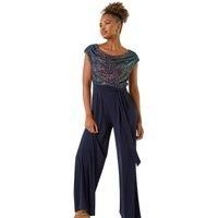 Sequin Bodice Cowl Neck Jumpsuit from Roman. Make a dazzling entrance in this black sequin bodice jumpsuit. Featuring a stylish cowl neck, this full length jumpsuit is perfect for evening events and special occasions during the Autumn and Winter seasons. The sequin detailing adds a touch of glamour to the classic black colourway. Complete your look with heels and a chic blazer for a sophisticated and glamorous ensemble that will turn heads wherever you go! | Roman Women's Sequin Bodice Cowl Neck Jumpsuit in Navy | Size: 20 - Manufacturers part number: Roman_5063566461734