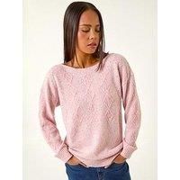 Petite Sequin Cable Knit Jumper from Roman. Cosy up in style this Autumn/Winter with this boat neck, long sleeve jumper. The dropped shoulder design and cable knit detail elevate this knitted jumper, featuring metallic sequin yarn for a touch of glamour. Finished with rib detailing on the sleeve cuffs and hem, this pull on style is both comfortable and chic. Pair with tailored trousers and heels for a perfect blend of comfort and sophistication! | Roman Women's Petite Sequin Cable Knit Jumper in Light Pink | Size: 14 - Manufacturers part numbers: Roman_5063566470088|162137p