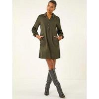 Collared Shift Shirt Dress from Roman. For a chic and sophisticated look this Autumn/Winter, opt for this collared shirt dress. The knee-length dress features applied pocket detail and elegant balloon sleeves with elasticated cuffs providing a touch of flair. Button detail to the bust point adds a classic touch to this timeless piece. Complete your outfit with tights and ankle boots for a stylish ensemble that transitions effortlessly from day to night. | Roman Women's Collared Shift Shirt Dress in Khaki | Size: 18 - Manufacturers part number: Roman_5063566472716