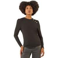 Ruched Button Stretch Top from Roman. Elevate your Autumn Winter wardrobe with this classic round neckline top. Designed with long sleeves and ruched shoulders with a chic button detail, this top combines style and comfort in a soft stretch jersey fabric. Pair with wide leg jeans and ankle boots for a sophisticated and stylish look that will take you from day to night effortlessly! | Roman Women's Ruched Button Stretch Top in Black | Size: 20 - Manufacturers part number: Roman_5063566481022