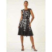 Embroidered Tie Waist Midi Dress from Roman. Embrace the enchanting beauty of the season with this stunning silver and black embroidered dress. With delicate floral embroidery, a flattering tie waist and elegant mesh detail, this midi length dress is perfect for special occasions. The short sleeves add a touch of sophistication to this exquisite piece. Complete your look with sleek strappy heels and a chic blazer for a perfectly polished ensemble. - Manufacturers part number: WRXEM