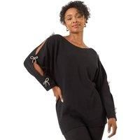 Petite Bow Trim Sleeve Knit Jumper from Roman. Stay stylish and chic this Autumn/Winter season with this charming jumper. Featuring long grown on sleeves with a trendy cold shoulder detail, this jumper stands out with delicate diamante bow details on the sleeves. The length finishing at the hips makes it perfect for pairing with jeans and ankle boots for a fashionable look that's perfect for any occasion. | Roman Women's Petite Bow Trim Sleeve Knit Jumper in Black | Size: 14 - Manufacturers part numbers: Roman_5063566495968|163215p