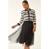 Petite Stripe Knit Midi Dress from Roman. Get ready to slay this Autumn Winter in this unique Petite stripe knit midi dress! A design that combines stripes with a mesh skirt creating a stylish contrast. The 3/4 sleeves make it perfect for transitioning seasons while the midi length adds an extra touch of elegance. Style with a denim jacket and ankle boots for a stunning fall look! | Roman Women's Petite Stripe Knit Midi Dress in Black | Size: 14 - Manufacturers part number: Roman_5063566496989