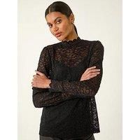 Lace Frill High Neck Stretch Top from Roman. Showcase your feminine side with this elegant lace detail top, perfect for the Autumn/Winter season. Crafted from a stretchy jersey fabric, this top features delicate lace frill detailing throughout and long sleeves for added warmth. The high neck adds a touch of sophistication while the hip-length cut ensures a flattering silhouette. Pair with jeans and ankle boots for a chic and stylish ensemble. | Roman Women's Lace Frill High Neck Stretch Top in Black | Size: 16 - Manufacturers part number: Roman_5063566503830