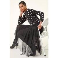 Polka Dot Mesh Midi Dress from Roman. Add a touch of elegance to your Autumn/Winter wardrobe with this stunning polka dot midi dress. With a knitted polka dot print bodice and a mesh skirt, this dress exudes charm and sophistication. The button detailing on the bodice and welt pocket detail add a unique touch, while the long sleeves and round neck create a classic silhouette. Pair with tights and heeled boots for a chic and stylish look that's perfect for any occasion! | Roman Women's Polka Dot Mesh Midi Dress in Black | Size: 14 - Manufacturers part number: Roman_5063566507265