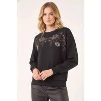 Floral Embroidered Stretch Top from Roman. Add a touch of elegance and flair to your Autumn/Winter wardrobe with this stunning floral embroidery sweatshirt. The top boasts beautiful floral embroidery details on the soft fabric, featuring a cosy round neckline and stylish dropped sleeves for a relaxed fit. Finishing at the hip, this top is versatile and perfect for everyday wear. Pair with jeans and ankle boots for a chic and effortless look that will take you from day to night with ease! | Roman Women's Floral Embroidered Stretch Top in Black | Size: 14 - Manufacturers part numbers: Roman_5063566515468|194674p