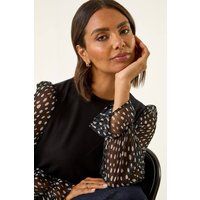 Printed Mesh Sleeve Top from Roman. Add a touch of elegance to your Autumn/Winter wardrobe with this stylish mesh sleeve top. Featuring eye catching mesh printed sleeves, a classic round neckline, and a comfortable stretchy jersey bodice that finishes at the hips, this top is perfect for effortless styling. The long sleeves add a chic touch, making it ideal for pairing with jeans and ankle boots for a trendy yet sophisticated look. | Roman Women's Printed Mesh Sleeve Top in Black | Size: 20 - Manufacturers part number: Roman_5063566516076