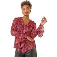 Floral Frill Metallic Blouse from Roman. Elevate your look with this floral blouse crafted from luxurious satin stripe fabric enhanced with delicate metallic threads for a touch of shimmer. Featuring a soft frill detail at the neckline and down the centre front, along with subtle button accents, this long sleeve piece blends femininity with sophistication. Perfectly styled with tailored trousers and heels for an effortlessly elegant outfit, whether for the office or a chic evening occasion. | Roman Women's Floral Frill Metallic Blouse in Pink | Size: 18 - Manufacturers part number: Roman_5063566517035