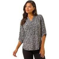 Leaf Print V-Neck Stretch Top from Roman. Stay stylish and on-trend this Autumn Winter in our fabulous leaf puff print top. Featuring a trendy v-neckline and 3/4 tabbed sleeves with a shoulder pleat detail, this top is perfect for adding a touch of elegance to your wardrobe. Made from a comfortable stretch fabric, this top drapes beautifully in a shirt shape. For a complete fall look, pair with jeggings and ankle boots! | Roman Women's Leaf Print V-Neck Stretch Top in Black | Size: 12 - Manufacturers part number: Roman_5063566521629