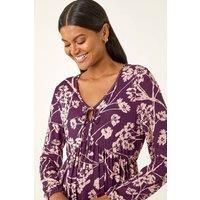 Floral Print Tie Front Stretch Top from Roman. Go for a stroll in style with our floral printed tunic top featuring a feminine v-neckline and playful tie front detail. Cut from comfy stretch jersey fabric, this top keeps you warm with its long sleeves. The tunic shape provides a flattering fit, perfect for pairing with a denim jacket and jeggings for a complete Autumnal look! | Roman Women's Floral Print Tie Front Stretch Top in Purple | Size: 10 - Manufacturers part number: Roman_5063566525405