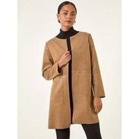 Petite Faux Suede Jacket from Roman. Add a touch of sophistication to your Autumn/Winter wardrobe with this chic faux suede pocket jacket. Featuring a classic round neck and long set-in sleeves, this jacket exudes effortless style. The applied patch pocket adds a unique detail to the unlined jacket, and the pull-on style ensures easy wear. Pair with cosy knitwear and your favourite jeans for a stylish and comfortable look that's perfect for everyday. | Roman Women's Petite Faux Suede Jacket in Tan | Size: 10 - Manufacturers part numbers: Roman_5063566525788|150539p