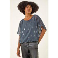 Foil Print Bubble Hem Top from Roman. Add a touch of glamour to your Autumn/Winter wardrobe with this stunning foil print bubblehem top. Designed in an overlay style with chic short sleeves and a classic round neckline, this top is perfect for both day and evening wear. The eye-catching foil print adds a touch of sparkle to any outfit, making it a versatile piece. Pair with your favourite jeans and heeled boots for a trendy and stylish look that will take you from day to night effortlessly! | Roman Women's Foil Print Bubble Hem Top in Grey | Size: 10 - Manufacturers part numbers: 202321p|Roman_5063566533400