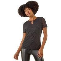 Embellished Keyhole Stretch Top from Roman. Keep your style on point with this hotfix keyhole top, a perfect choice for Autumn Winter. The sophisticated round neckline features a trendy keyhole front, while the short sleeves offer a stylish finish. Cut from a comfortable stretch fabric that ensures a flattering fit, this top is elevated with a stunning hotfix detail for a touch of glam. Pair with leather trousers and heeled boots for a flawless party look that will keep all eyes on you! | Roman Women's Embellished Keyhole Stretch Top in Black | Size: 12 - Manufacturers part numbers: Roman_5063566538719|194772p