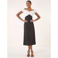 Frill Contrast Bardot Dress from Roman. Make a statement this Autumn/Winter with this frill contrast fit & flare dress. The unique bardot neckline is both elegant and on-trend, enhancing your collarbones beautifully. The frill contrast detail adds a touch of fun to the classic fit & flare silhouette, making it a perfect choice for any special occasion. Pair with strappy heels and a chic blazer for a sophisticated and stylish look that will turn heads wherever you go! | Roman Women's Frill Contrast Bardot Dress in Black | Size: 18 - Manufacturers part number: Roman_5063566540309