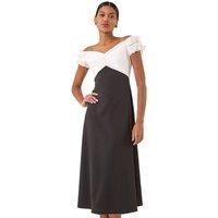 Frill Contrast Bardot Dress from Roman. Make a statement this Autumn/Winter with this frill contrast fit & flare dress. The unique bardot neckline is both elegant and on-trend, enhancing your collarbones beautifully. The frill contrast detail adds a touch of fun to the classic fit & flare silhouette, making it a perfect choice for any special occasion. Pair with strappy heels and a chic blazer for a sophisticated and stylish look that will turn heads wherever you go! | Roman Women's Frill Contrast Bardot Dress in Black | Size: 10 - Manufacturers part number: Roman_5063566540347