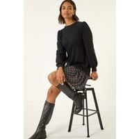 Geometric Mix Print Mini Dress from Roman. Add a playful pop of print to your wardrobe with this geometric print mini dress. Designed with a flattering round neckline and long sleeves, this dress features a contrasting printed frill skirt that adds movement and charm. The swing silhouette offers a relaxed yet stylish fit, making it perfect for all-day comfort with a touch of flair. Falling above the knee, it's a versatile piece you can dress up or down, style with tights and ankle boots for a chic, layered Autumn look. | Roman Women's Geometric Mix Print Mini Dress in Black | Size: 20 - Manufacturers part number: Roman_5063566540613