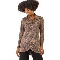 Paisley Print Cowl Neck Stretch Top from Roman. Stay stylish and cosy this Autumn Winter in this paisley print tunic top. The trendy cowl neckline and long sleeves will keep you warm while the stretch jersey fabric ensures a comfortable fit. Pair with wide leg trousers and ankle boots for a complete look! | Roman Women's Paisley Print Cowl Neck Stretch Top in Taupe | Size: 14 - Manufacturers part numbers: Roman_5063566542860|191101p