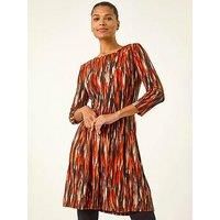 Abstract Print Panel Stretch Dress from Roman. Make a bold statement this Autumn Winter with this abstract panel dress. Featuring a stylish round neck and abstract print panel detail, this knee-length dress offers a flattering fit and 3/4 sleeves for added sophistication. Pair it with a denim jacket and ankle boots to create a stunning fall look that's sure to turn heads wherever you go! | Roman Women's Abstract Print Panel Stretch Dress in Orange | Size: 12