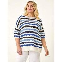 Curve Wave Stripe Jumper from Roman. Elevate your knitwear collection with this chic wavy stripe jumper for the Spring/Summer season. Adorned with an all-over wavy knit detail, this trendy jumper features a classic round neckline and flattering 3/4 sleeves. Finishing at the low hip, this versatile piece is perfect for casual days out. Pair with your favourite jeans and trainers for a stylish off-duty look that's both comfy and fashionable. | Roman Women's Curve Wave Stripe Jumper in Blue | Size: 16 - Manufacturers part number: Roman_5063566574151