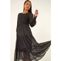 Petite Spot Print Dress from Roman. Flaunt your style this Autumn/Winter in this stunning spot print dress. The fit and flare silhouette is accentuated by a shirred waist, creating a flattering shape. This dress is perfect for any occasion. Pair with tights and heeled boots for a chic and elegant look that will turn heads wherever you go! | Roman Women's Petite Spot Print Dress in Black | Size: 8 - Manufacturers part number: Roman_5063566582231