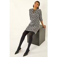 Tile Print Tie Keyhole Stretch Dress from Roman. Elevate your Autumn Winter wardrobe with this chic tile keyhole dress. Designed with a trendy tie neckline and keyhole detail, this knee-length dress is crafted from a comfortable stretch woven fabric featuring a striking jacquard tile print. The shift shape with 3/4 sleeves is both stylish and versatile, making it perfect for any occasion. Complete your outfit by pairing it with tights and ankle boots! | Roman Women's Tile Print Tie Keyhole Stretch Dress in Black | Size: 20 - Manufacturers part number: Roman_5063566598447
