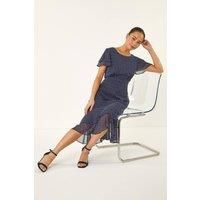 Petite Spot Frill Hem Dress from Roman. Get your wardrobe ready for Spring and Summer with this elegant spot frill dress. Boasting a round neckline and short sleeves, this dress features a flattering double frill hem for a touch of playful movement. Cut from a comfortable woven fabric, this piece ensures a perfect fit while keeping you comfortable all day long. Style with strappy heels and a blazer for a chic and sophisticated look that's perfect for any occasion! | Roman Women's Petite Spot Frill Hem Dress in Navy | Size: 18 - Manufacturers part number: Roman_5063566647688