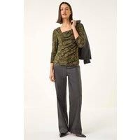 Cowl Neck Jacquard Stretch Top from Roman. Get ready to make a statement in this stylish cowl neck top. Crafted in a stretch jersey fabric with a textured jacquard detail, this top features a flattering cowl neckline and long sleeves. The unique fabric adds an extra touch of sophistication. Perfect for the Autumn Winter season, pair this top with leather trousers and heeled boots for a fashionable look! | Roman Women's Cowl Neck Jacquard Stretch Top in Khaki | Size: 14 - Manufacturers part numbers: Roman_5063566695054|190787p