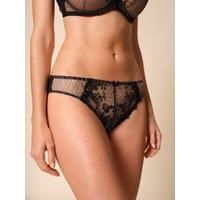 Bold and effortlessly chic, the Lacage Brief in Black combines intricate embroidery with metallic yarn for a touch of glamour. With lace-up trims for a decorative finish, this brief offers a flattering fit with its elastic waistband and high-cut legs. A perfect blend of artistry and modern flair, designed to elevate your everyday lingerie collection./r/n/r/n/r/nSmall Cup Model wears 32D and XSLarge Cup Model wears 34E and M/r/n/r/n | Gossard Women's Lacage Brief - Black | Size: XL - Manufacturers part numbers: BA6U|Gossard_5063571003547