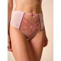 Bold and effortlessly chic, the Lacage High Waist Brief in Rose combines intricate embroidery with metallic yarn for a touch of glamour. Featuring lace-up trims for a decorative finish, this brief offers extended coverage, sitting higher on the waist for added support and comfort. A perfect fusion of artistry and modern sophistication, designed to make a statement in any wardrobe./r/n/r/n/r/nSmall Cup Model wears 32D and XSLarge Cup Model wears 34E and M/r/n | Gossard Women's Lacage High Waisted Brief - Rose | Size: Large - Manufacturers part number: Gossard_5063571003691
