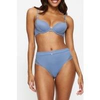 The Charlotte high waisted thong by KBX seamlessly blends soft brushed microfiber with animal-pattern lace. With a flattering and comfortable high-rise shape, the elasticated waistband fits close to your body and the lace around the hips ensures the thong is invisible under your outfit. Decorated with subtle brushed gold hardware at the centre front. | KBX Women's Charlotte High-Waisted Thong in Blue | Size: 14