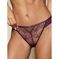 KBX Joelle Brazilian The Joelle Brazilian in dark purple by KBX is made from a blend of floral embroidered mesh, microfiber and mesh. The flattering folded mesh side straps offer a seamless finish under clothing. Complete with a brushed gold branded hardware at the centre front, a Brazilian back with keyhole detail at the top Made from two-tone floral embroidered mesh, microfiber and mesh Material Content: Poly amide 90 %,Elastane 10 % Brushed gold branded hardware at the centre front Folded mesh side s...
