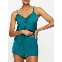 KBX Margot Cami-Set Lounge with elegance in the green Margot pyjama cami set by KBX. This two-piece set is made from abstract lace and sand-washed satin fabric that drapes over your body. Designed with a v-shaped neck and back, adjustable shoulder straps, brushed gold hardware and an elasticated waistband for pure comfort. Made from sand-washed satin and abstract lace Material Content: Polyester 100 % Brushed gold hardware Two-piece cami top and shorts set V-shaped neck and back Adjustable shoulder stra...
