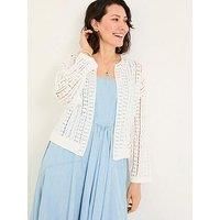 FatFace Florence Knit Cardigan Size & Fit True to size - order your usual size Regular fit Available in sizes 6 - 24 Details Florence Cardigan by FatFace White Crochet fabric Long sleeves Round neckline Material & Care Material Content: Body: 97% Cotton,3% Nylon,Backing: 100% Polyester Washing Instructions: Machine Washable