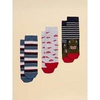 Joules Boys 3 Pack Dino Socks Size & Fit 6-8.5 Younger - 12.5-3.5 Older Details Boys 3 Pack Dino Socks by Joules Multi Ankle socks 1 x Stripe design 2 x Dinosaur design Material & Care Material Content: 100% Cotton Washing Instructions: Machine Washable