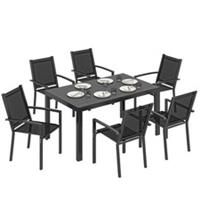 Seven-piece garden dining set: Comes with a rectangular dining table and six matching dining armchairs - plenty of seating room for you and company to enjoy meals, chats and relaxing outdoors together. Stackable chairs: Space-saving garden furniture set - keep them stored altogether when not being used. Texteline fabric on the wide, deep seat and supportive backrest offers a breathable, cool feeling. Rustic-style dining table: Plastic wood composite board tabletop is tough, water-resistant and low-maint...
