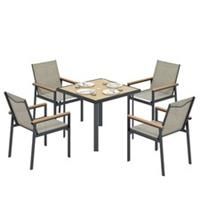 Wood-look armrests add a smooth, natural place to rest your arms. The outdoor table and chairs will support you. Use a furniture cover to extend the service life of this patio furniture set. Easy to wipe clean in seconds.