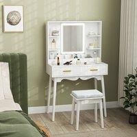 Whatever the time of day, it's easy to get ready with this HOMCOM dressing table. The light is fitted with an outer LED: set the light between the warm, natural or cool white colour, so you'll always be perfectly lighted, no matter the time of the day. It comes in a soft white colour and fitted with gold coloured handles for an elegant design, which looks great in plenty of different home styles. Complete with a padded stool, for you to sit and get ready in comfort. | HOMCOM Dressing Table with LED Lighted Mirror & Cushioned Stool White