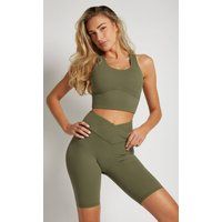 Balancing comfort and style for workouts and active days, these khaki shorts by ZaraMcDermott feature flattering crossover detail at the front, highlighting the high-waisted shape. | Rise Khaki Crossover Shorts - Manufacturers part number: rise_5063604009843