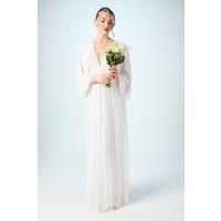Elegant V neckline front and back, creating a sophisticated silhouette Stunning hand-stitched sequin embellishment throughout for a captivating shimmer Flowing kimono sleeves adding graceful movement and contemporary flair Floor-length design with a gentle train for a dramatic bridal entrance Delicate pleating detail that enhances the feminine drape of the fabric Make a breathtaking statement on your special day with this exquisitely crafted wedding gown. The striking V neckline fram... - Manufacturers part number: Coast_5063631462079