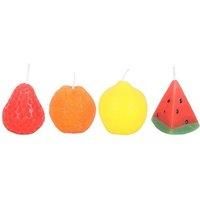 Material: Paraffin Wax. Design: Lemon, Strawberry, Watermelon, Orange. Burning time: 2.5 hours. Please Note: Avoid Flammable Materials, Do Not Burn for More Than One Hour at a Time, Not A Toy, Not Edible. Packaging: Boxed, Cardboard. Unscented. | Something Different Fruit Shaped Candle (Pack of 4) in Red