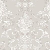 Material: Paper. Design: Damask, Floral. Design Repeat: 53cm. Colourfast. Finish: Matte. Paste the Paper, Straight Pattern Match. | Rasch Amelie Damask Wallpaper in Grey