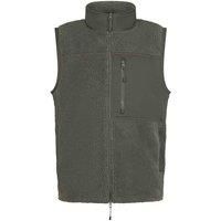 Material: Cotton Twill, Polyester. Fabric: Sherpa. Design: Plain. 300gsm. Access For Dration, Back Yoke, Flatlock Stitching, Tag Free. Neckline: Contrast Collar, Funnel Neck. Sleeve-Type: Sleeveless. Fit: Regular. Pockets: 2 Side Pockets, 1 Chest Pocket, Zip. Fastening: Front Zip, Stud. Hem: Curved, Drawcord. Sustainability: Amfori, BSCI, GRS Certified, Sedex. XS: 36 in. S: 38 in. M: 40 in. L: 42 in. XL: 46 in. XXL: 48 in. | Front Row Men's Sherpa Gilet in Dark Olive | Size: 2XL